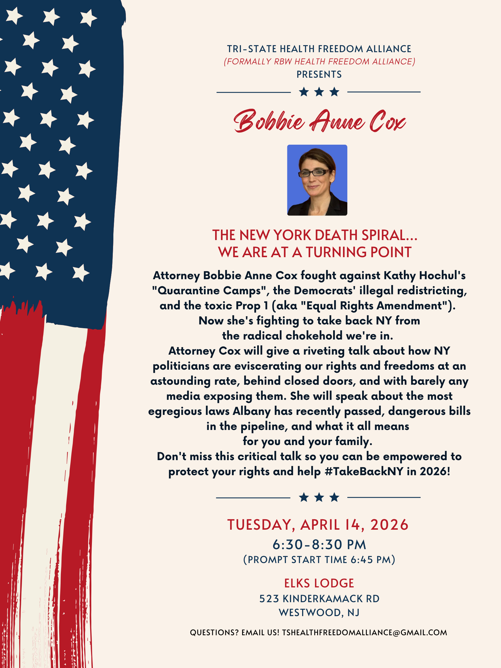 The New York Death Spiral…We Are At A Turning Point ~Guest Speaker: Bobbie Anne Cox, Esq. April 14 @ 6:30 pm - 8:00 pm Elks Lodg 523 Kinderkamack Road, Westwood, NJ, United States For more information email: rbwhealthfreedom@gmail.com
